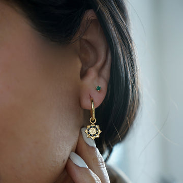 From our Shield of Protection Collection, this gold earring, Huggie, is designed to be worn every day, symbolizing life renewing youth, eternity, purity, and divinity, and representing peace, truth, and divine power.